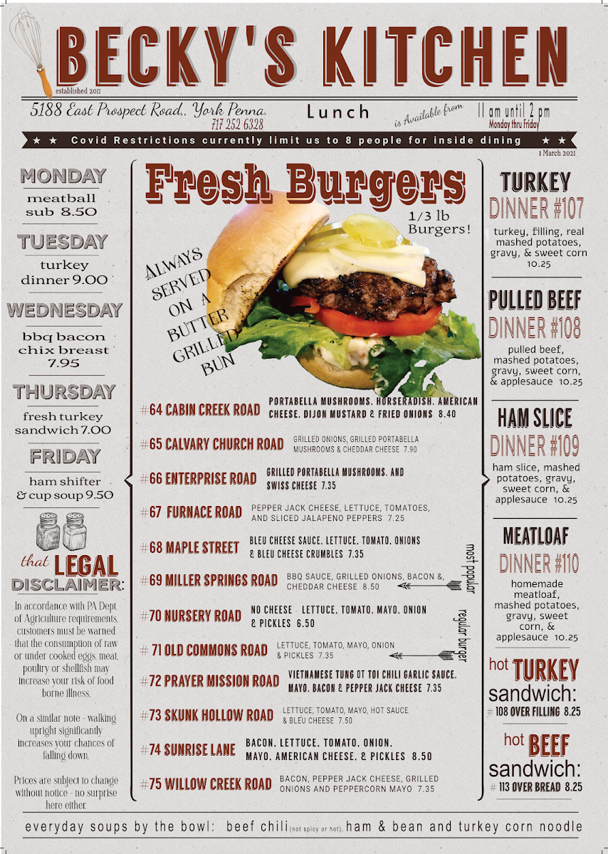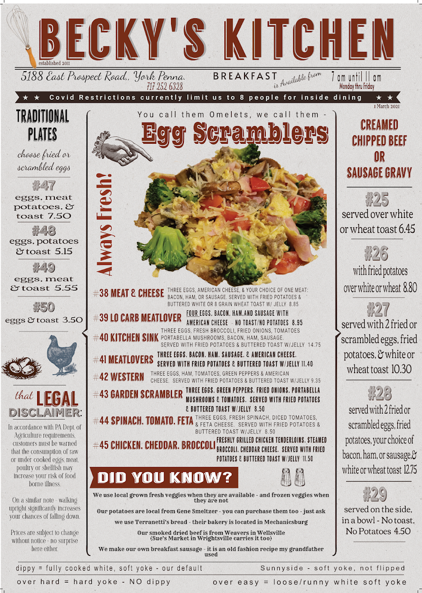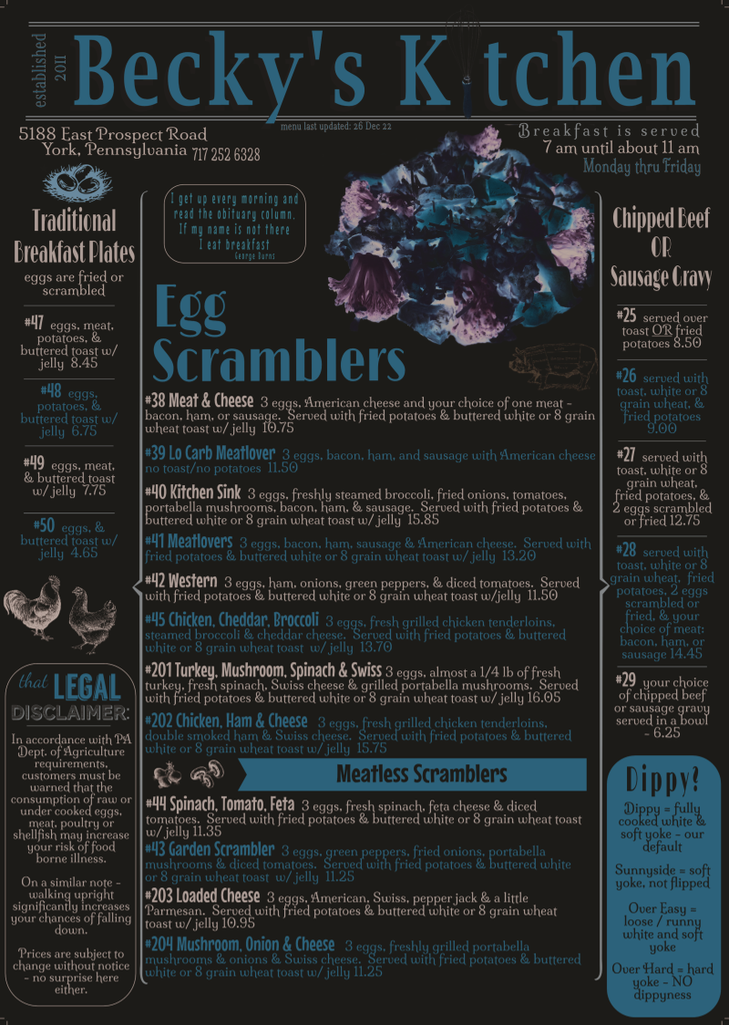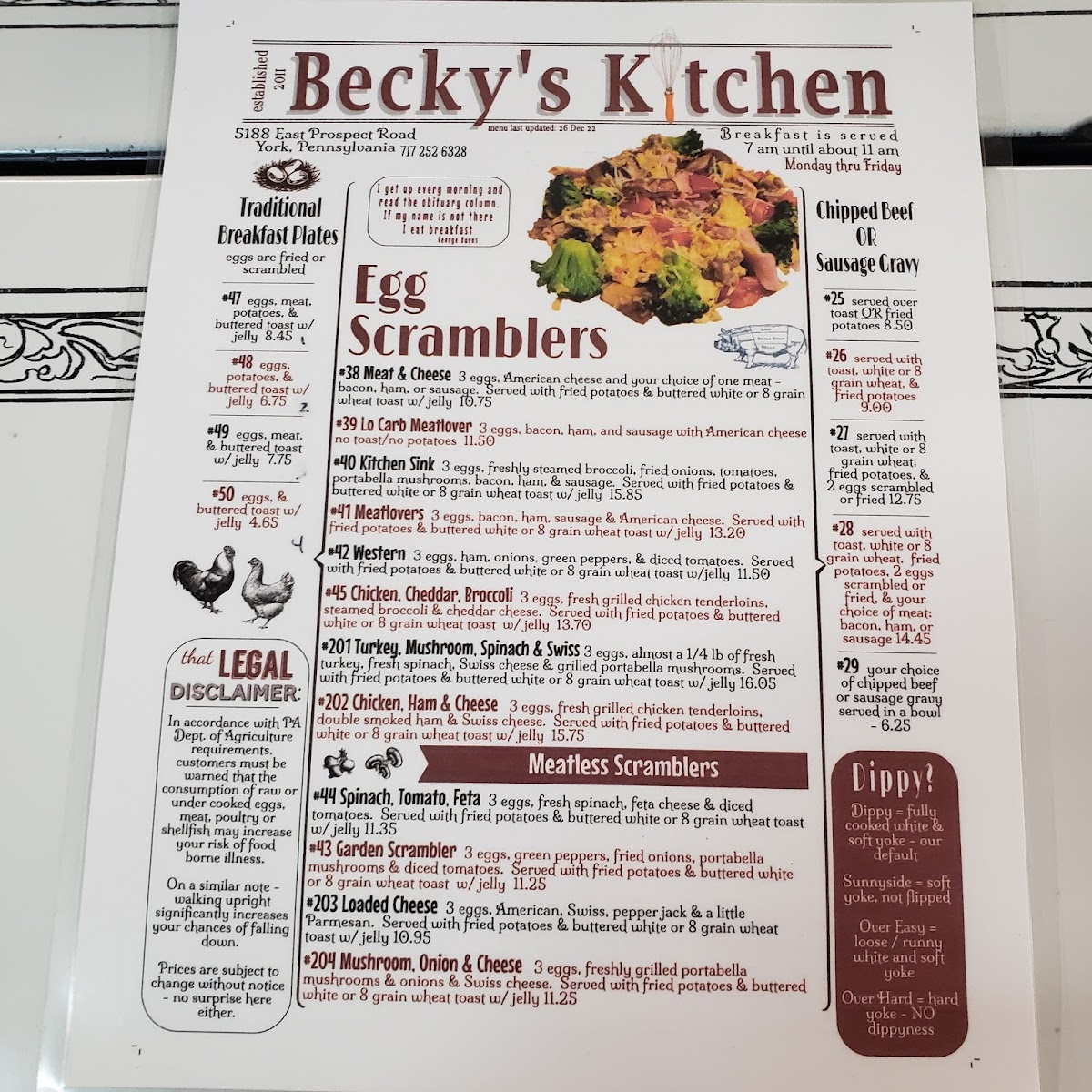 Becky’s Kitchen offers a thoughtfully simple menu that reflects its cozy, home-style atmosphere. The focus is on hearty American classics and comforting breakfast and lunch favorites, served in a warm, inviting setting where casual dining feels like visiting a friend’s kitchen.