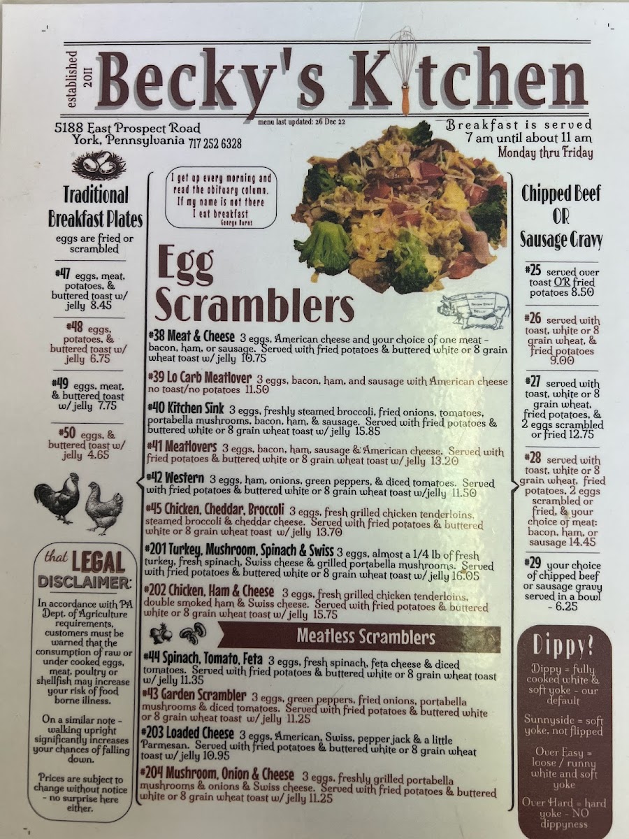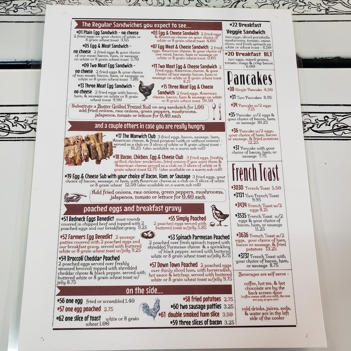 Whether you’re stopping by for a relaxed breakfast or a midday meal, the menu includes a range of satisfying options such as fluffy blueberry pancakes, scrambled eggs with fresh vegetables, and unique takes on sandwiches like the cheeseburger club or pulled pork. There’s a good balance between classic comfort dishes—like Maryland crab soup or pot roast—and playful specialties including homemade fastnachts and the Redneck Benedict.